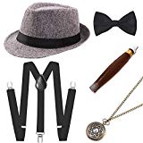 BABEYOND 1920s Mens Gatsby Costume Accessories Set 30s Panama Hat Elastic Y-Back Suspender Pre Tied Bow Tie Pocket Watch and Plastic Cigar (Gray Set