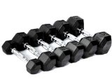 These dumbbells feature durability that simply can’t be matched. Made from solid cast iron with a 6-sided anti-roll design and encased in rubber, this dumbbell is both stylish and durable. Heads are securely fastened with a uniquely designed pin mechanism that means this equipment is about as low-maintenance as it gets.