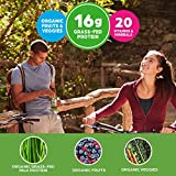 - 16 grams of organic protein (from organic whey protein concentrate and organic grass fed milk protein concentrate), 2 grams of dietary fiber, 20 vitamins and minerals, 10 fruits and vegetables (including acai, spinach, kale), 250 calories per serving