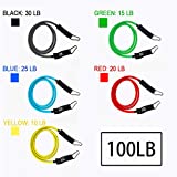 - Adjustable Resistance Bands:Yellow 10-15lbs.Red 15-20lbs.Blue 20-25lbs.Green 25-30 lbs.Black 30-40lbs.All exercise bands can be used alone stacked in any combination to a maximum equivalent of 100 lbs.