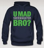 U MAD BRO? SHERMANATOR Hoodie (Seattle Seahawks) (XL) Hanes Brand Adult Hooded Sweatshirt Made of 50% Cotton, 50% Polyester Navy Blue with Action Green Design State-of-the-Art Digital Printing Process Item